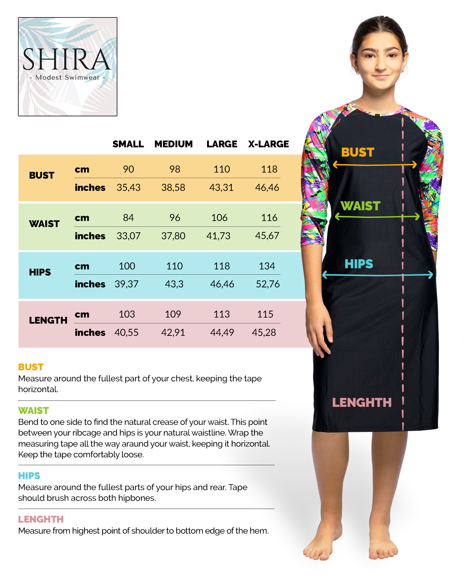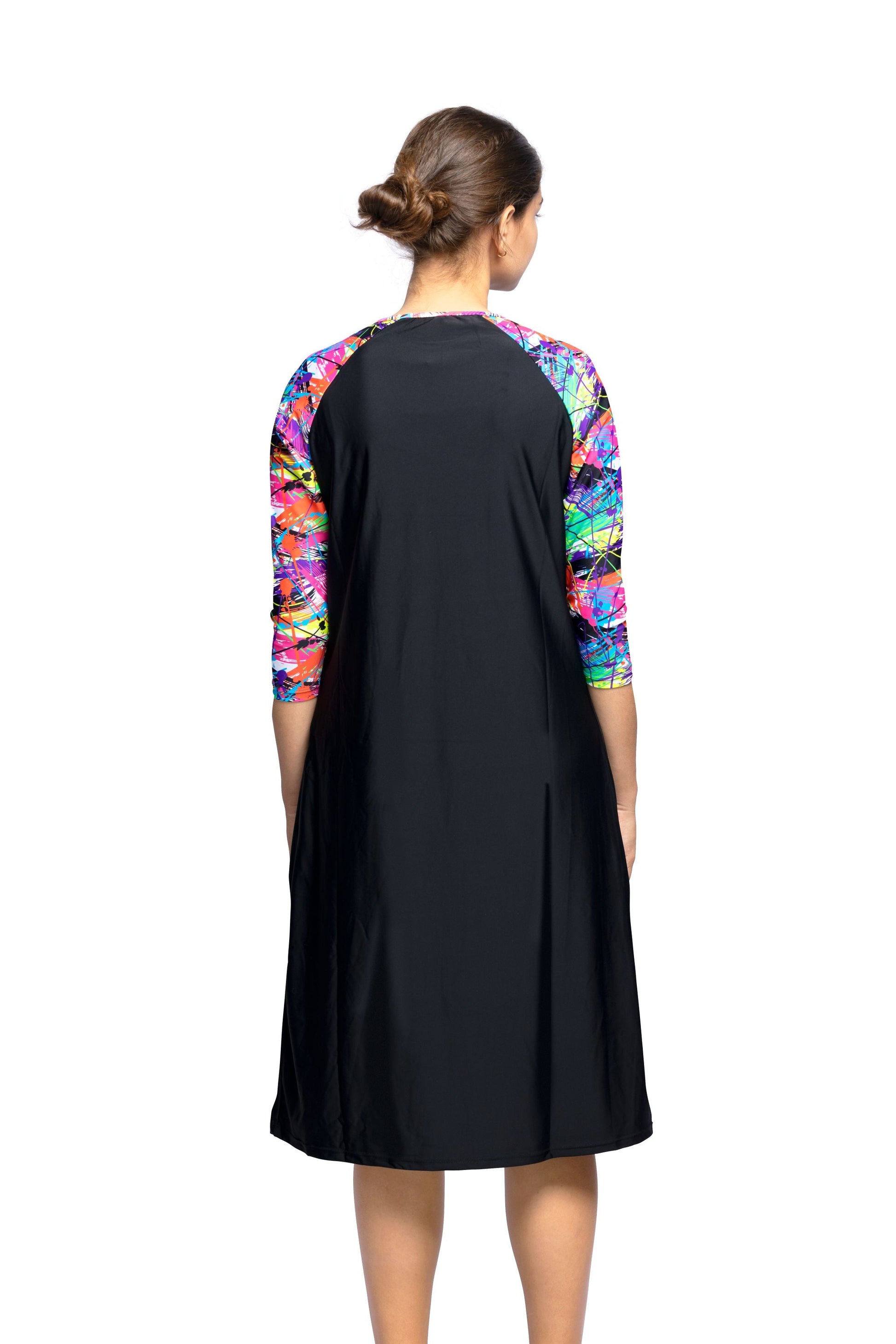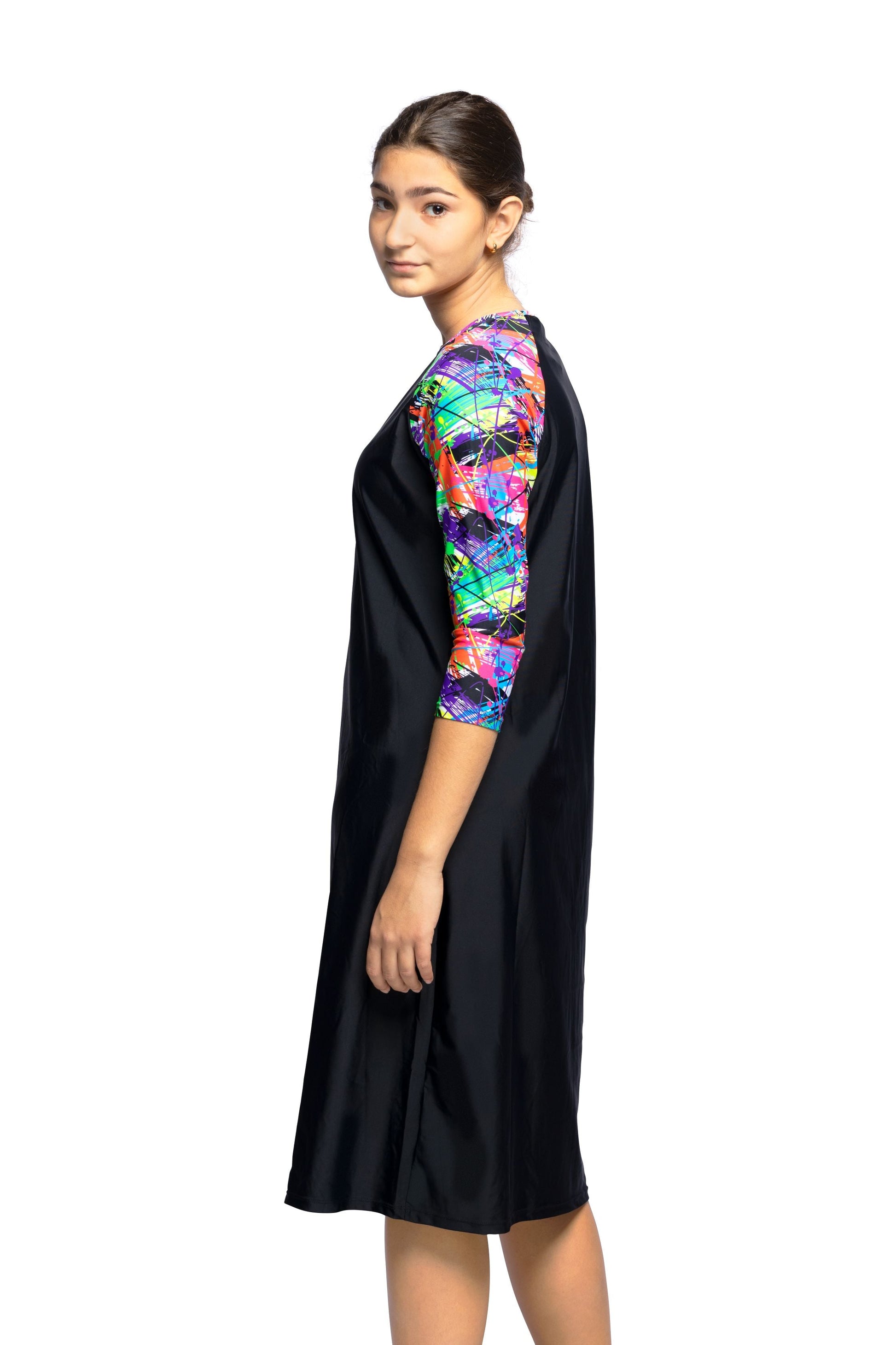 Woman Modest Tznius 3/4 Raglan Sleeve Athletic Swimdress Beach Cover up UPF 50+ Sun Protection (Aruba in Black / Color Splash Sleeves)